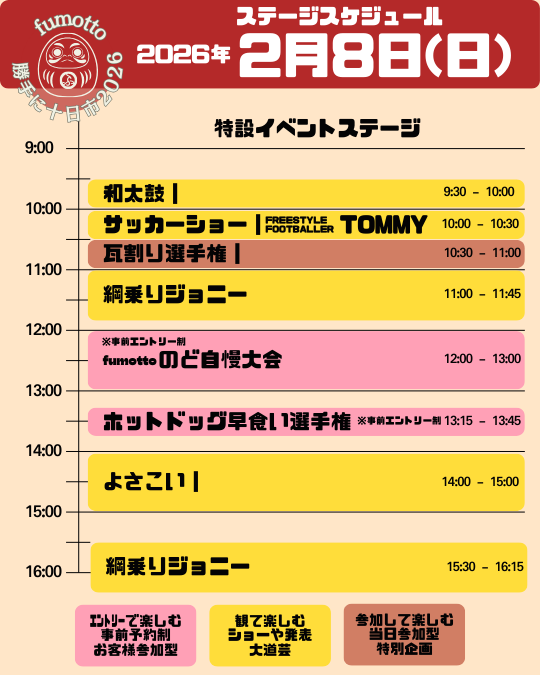 当日参加できる体験もたくさんご用意していますが、ステージイベントや体験イベントの事前エントリー(予約)を実施しています。第4回fumottoのど自慢大会、ダンボールアート、ホットドッグ早食い、生マグロ鉄火太巻きなどなど。詳細は、こちら(リンク)または画像をクリックしてチェック!