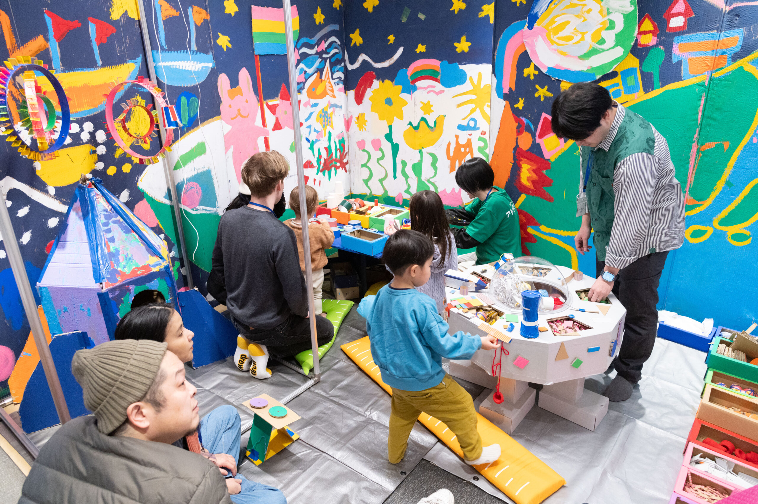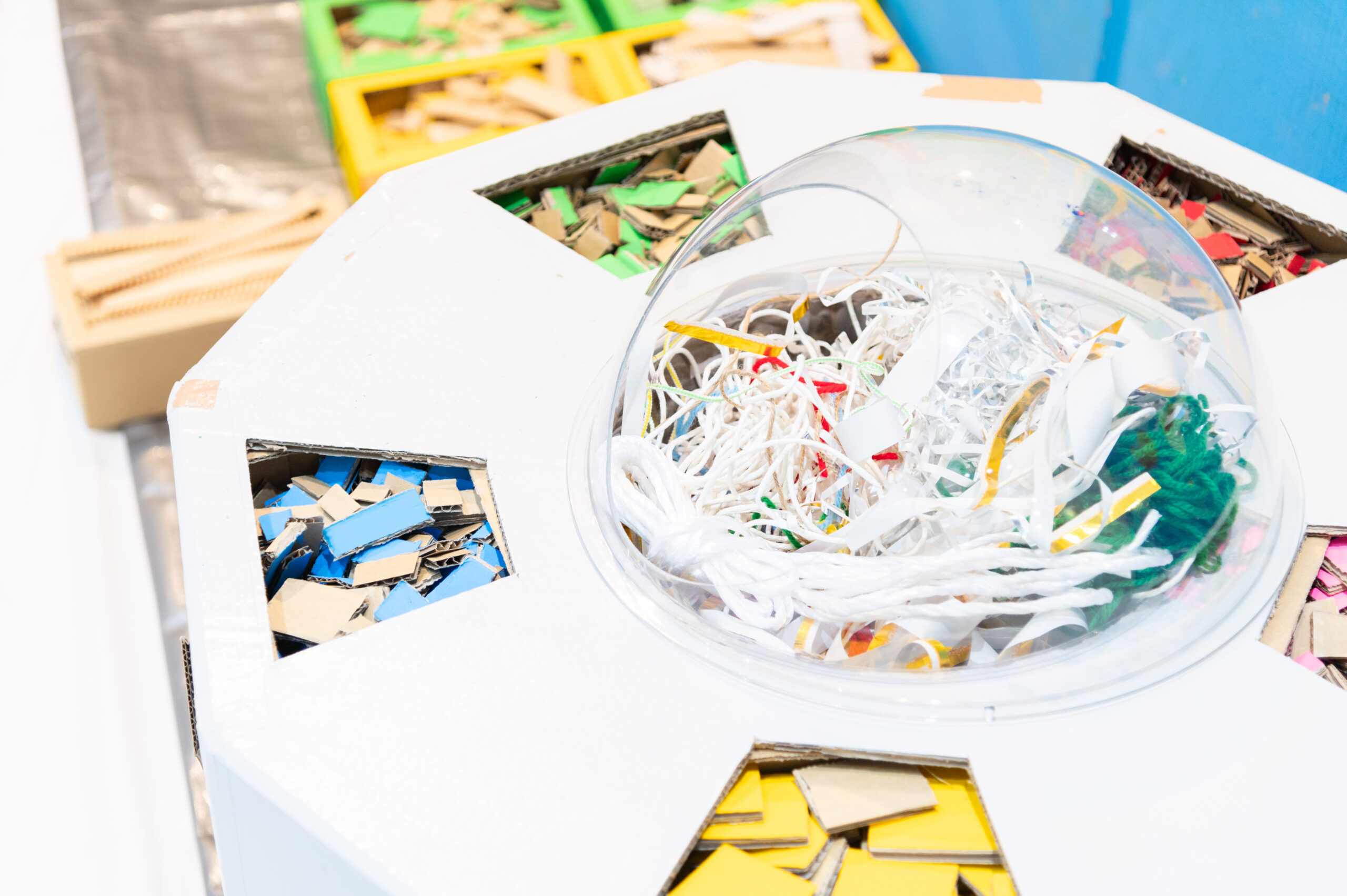 図工船エリアはアトリエヤマダのワークショップで出たカラフルなダンボール端材や企業の廃材など、基本的にインストラクターはつかず、来場者が自由に考え創作を楽しめる空間です。